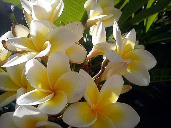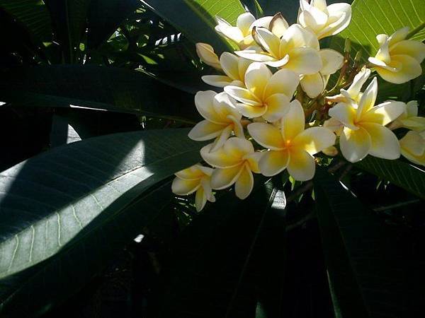 朋友告訴我,這叫做雞蛋花(很可愛的名子吧).又叫做緬梔.這是白花種.另外還有紅花緬梔.是典型亞熱帶植物.